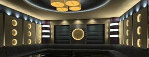 KTV應明亮寬敞。材質(zhì)上,要選用耐臟、易清潔的飾面為材料,地面與墻面采用具有連續(xù)性的圖案和花色,以加強空間立體感,同時,還要注意減少噪音的影響。