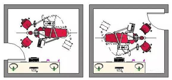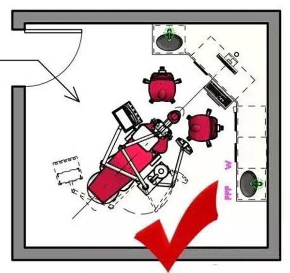 關(guān)于牙椅設備的擺放原則一是 病人進入診室,坐上牙椅的路程最短為佳,二是盡量避免患者腳端直接對著門的方向,病人隱私差,不安情緒強。如下圖: