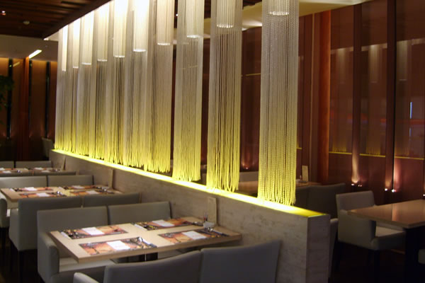 由于餐廳空間有限,所以許多建材與設(shè)備,均應(yīng)作經(jīng)濟(jì)有序的組合,以顯示出形式之美。所謂形式美,就是全體與部分的和諧。簡單的平面配置富于統(tǒng)一的念,但容易因單調(diào)而失敗;復(fù)雜的平面配置富于變化的趣味,但卻容易松散。配置得當(dāng)時,添一份則多,減一份嫌少,移去一部分則有失去和諧之感。因此,設(shè)計時還是要運用適度的規(guī)律把握秩序的精華,這樣才能求取完整而又靈活的平面效果.在設(shè)計餐廳空間時,由于備用途所需空間大小各異,其組合運用亦各不相同,必須考慮各種空間的適度性及各空間組織的合理性。